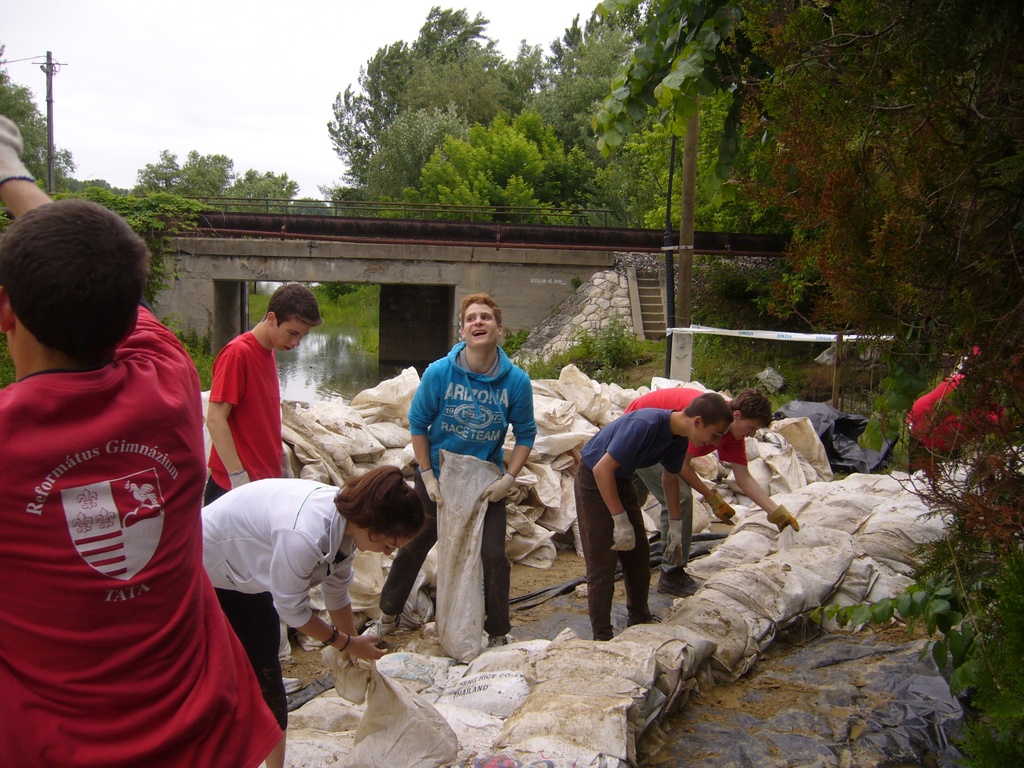 A hétfői naptól kezdve már osztályonként, szervezett formában vittük ki önként jelentkező diákjainkat, akik megtöltötték a homokzsákokat (eddig összesen mintegy 12-15 ezer darabot), majd azokat kézről kézre adogatva készítették elő a gáton dolgozó szakemberek munkáját. Jó volt megtapasztalni, hogy milyen nagy összhang alakult ki a helybeli lakosok, valamint és közelből és messzebbről érkezett segítők között, a közös cél rövid idő alatt egy csapattá kovácsolt bennünket.