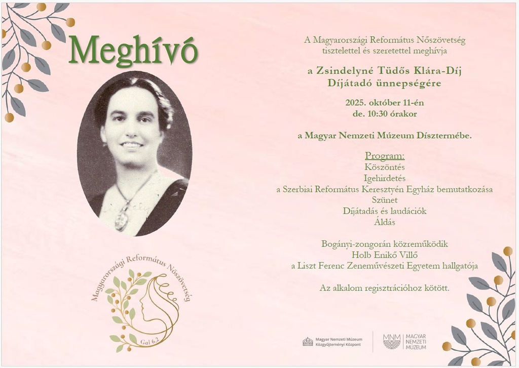 A Magyarországi Református Nőszövetség tisztelettel és szeretettel meghívja a Zsindelyné Tüdős Klára-Díj Díjátadó ünnepségére, 2025. október 11-én, de. 10:30 órakor a Magyar Nemzeti Múzeum Dísztermébe.