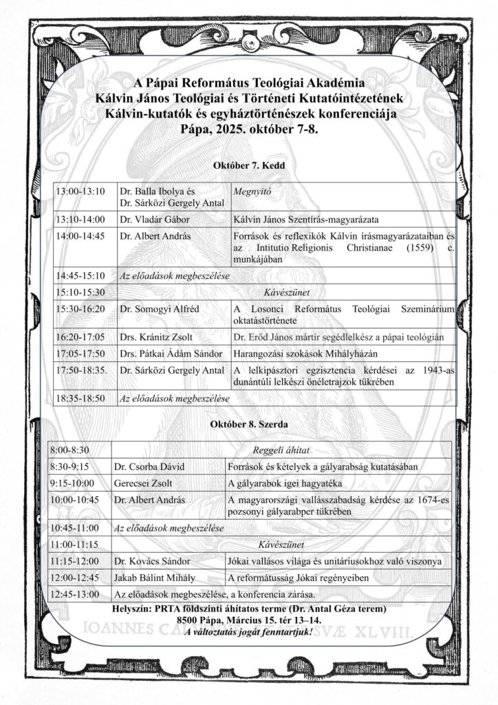 DTRE Kommunikációs Szolgálat, 2025-09-29 06:58:03A Pápai Református Teológiai Akadémia Kálvin János Teológiai és Történeti Kutatóintézete 2025. október 7-8 (kedd-szerda) között tartja idei Kálvin-kutatók és egyháztörténészek konferenciáját. Az idei konferencián Kálvin János Szentírás-magyarázata mellett különféle dunántúli egyháztörténeti évfordulókkal (is) foglalkoznak az előadóink.
