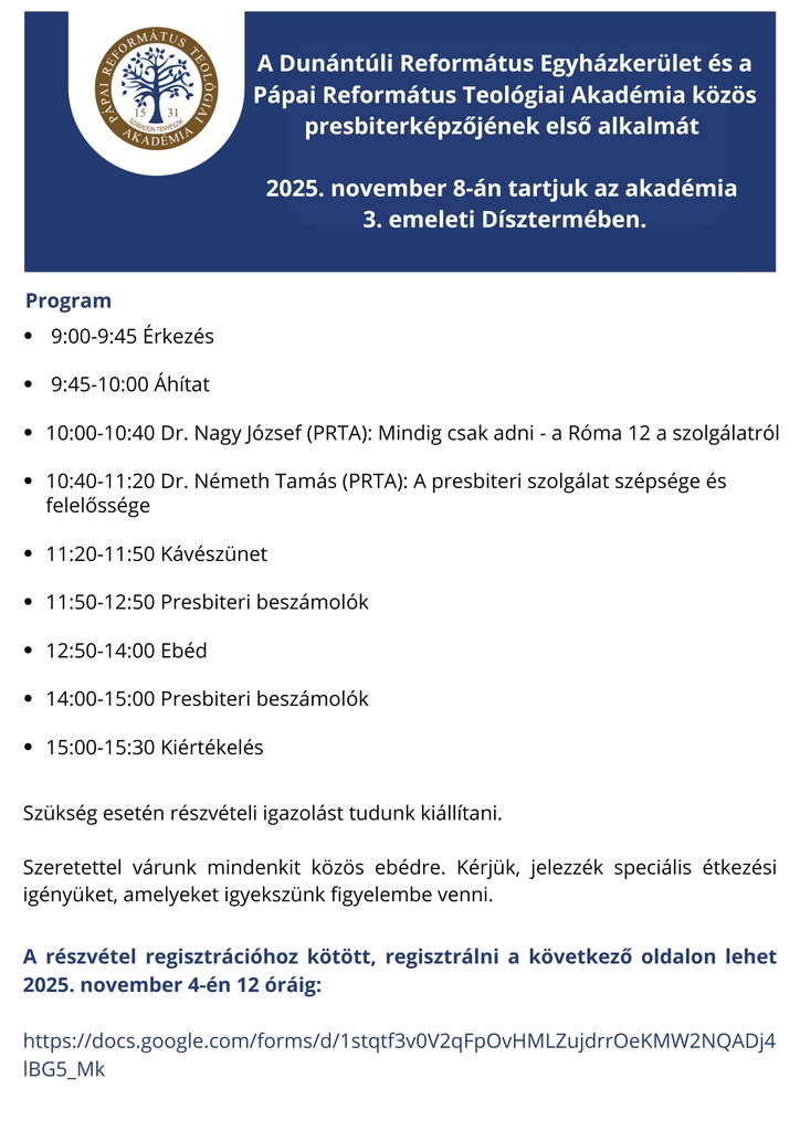 A Dunántúli Református Egyházkerület és a Pápai Református Teológiai Akadémia közös presbiterképzőjének első alkalma 2025. november 8-án lesz az akadémia 3. emeleti Dísztermében.