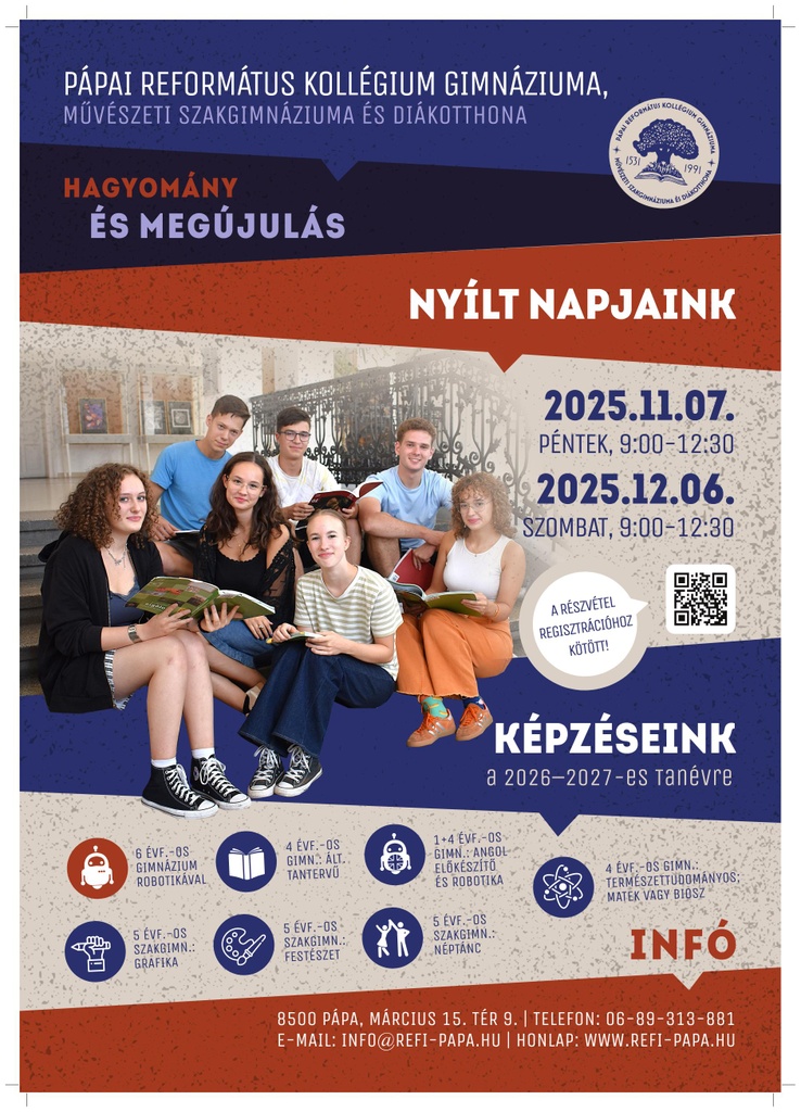 A Pápai Református Kollégium Gimnáziuma, Művészeti Szakgimnáziuma és Diákotthona nyílt napokat szervez a továbbtanulók részére. Az első alkalom 2025. november 07-én, a második 2025. december 6-án lesz.