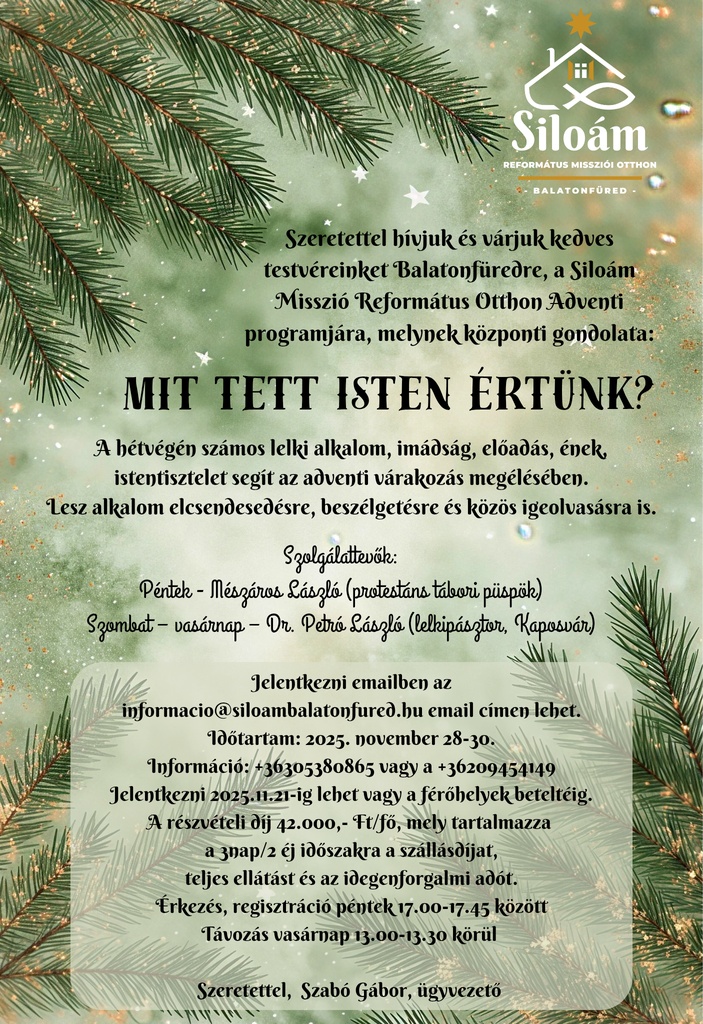 A Siloám Református Missziói Otthon az adventi időszakra kínál lelki feltöltődést november 28-30-án. A hétvége központi gondolata: Mit tett Isten értünk?