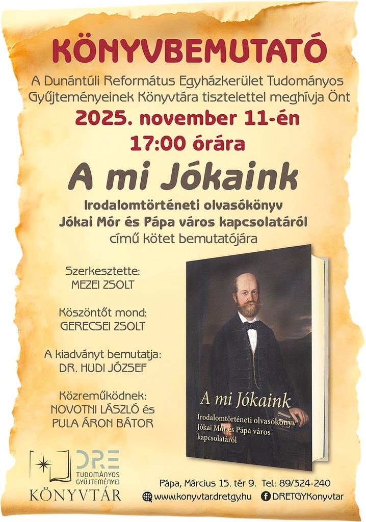 DTRE Kommunikációs Szolgálat, 2025-11-10 09:20:24Dunántúli Református Egyházkerület Tudományos Gyűjteményeinek Könyvtára könyvbemutató tart a Jókai.emlékévhez kapcsolódóan. 2025 november 11-én. 17.00 órakor mutatják be a Mezei Zsolt által szerkesztett, a Református Gyűjtemények által kiadott "A mi Jókaink" című kötet. Köszöntöt mond Gerecsei Zsolt gyűjteményi igazgató, a kiadványt bemutatja Hudi József főlevéltáros.