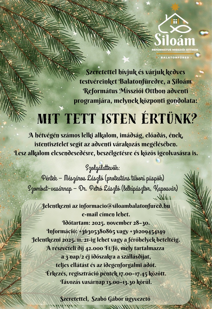DTRE Kommunikációs Szolgálat, 2025-11-11 07:16:14Adventi könyv- és ajándékvásár, csendeshétvége a lelki készülés jegyében. Szeretettel ajánljuk a Siloám Református Missziói Otthon adventi alkalmait.