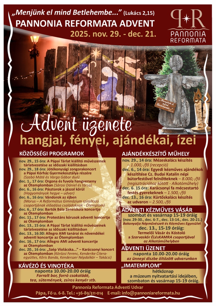 DTRE Kommunikációs Szolgálat, 2025-11-20 07:51:51Közösségi programok, kézműves foglalkozások, koncertek... A Dunántúli Református Egyházkerület Tudományos Gyűjteményei Pannonia Reformata Múzeuma idén is Adventer hangoló programokkal várja vendégeit.