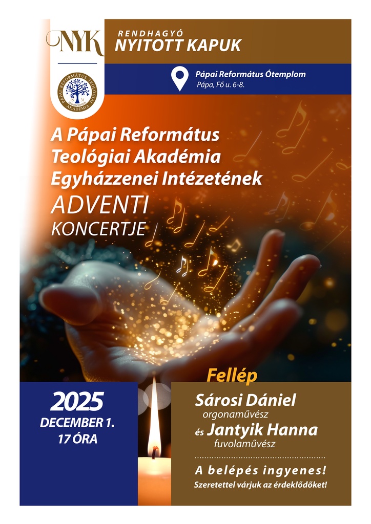 DTRE Kommunikációs Szolgálat, 2025-11-28 08:19:18Idén is muzsikával várja a teológia Egyházzenei Intézete a hallgatóságot advent idején. December 1-jén 17 órától a Református Ótemplom ad otthont Sárosi Dániel orgonaművész és Jantyik Hanna fuvolaművész koncertjének, melyre a belépés díjtalan.