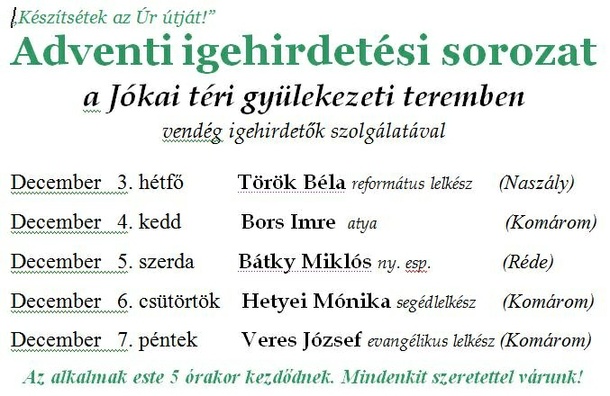 Ezzel az alkalommal egy időben az Asztalos Béla utcai gyülekezeti teremben adventi kézműves foglalkozást tartunk, melyre nagy szeretettel várunk mindenkit.