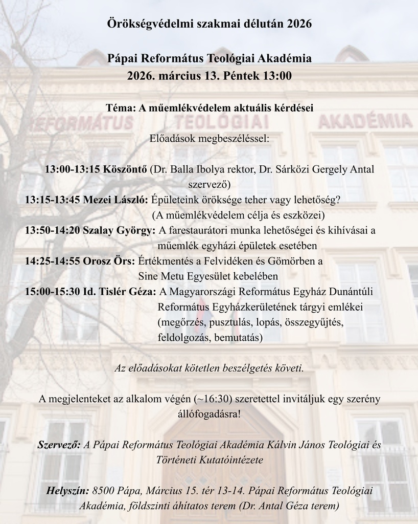 2026 tavaszán folytatódik a Dunántúli Református Egyházkerület és a Pápai Református Teológiai Akadémia Presbiterképző rendezvényeinek sora. A Következő alkalomra március 7-én kerül sor. A nap témája a fiatalok gyülekezetbe integrálásának lehetőségei és kihívásai lesz.