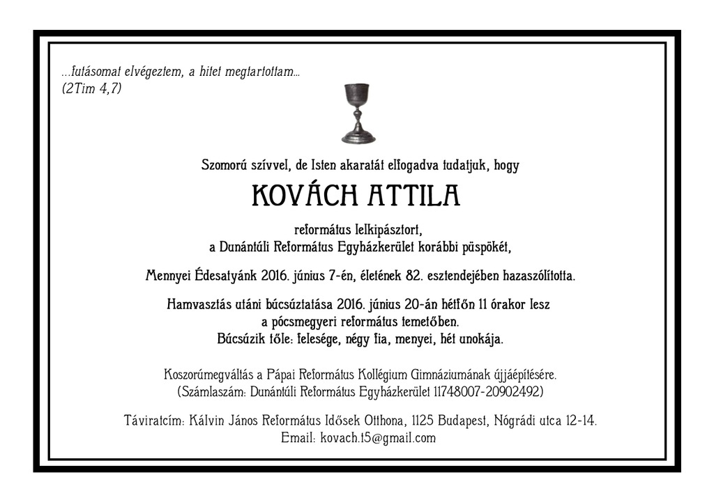 Gyászoló szívvel, de a feltámadás és az örök élet reménységével tudatjuk, hogy Főtiszteletű Dr. Kovách Attila püspök életének 82. évében, június 7-én elhunyt. Dr. Kovách Attila 1979 - 1990 között töltötte be a Dunántúli Református Egyházkerület püspöki tisztét.