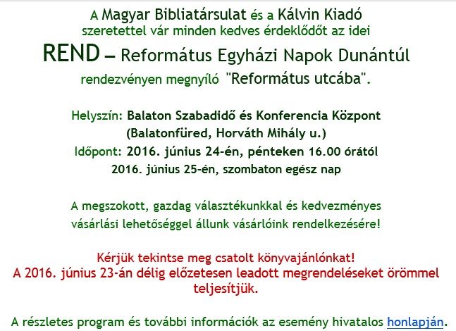 A ma kezdődő REND-re szeretettel várunk minden érdeklődőt! A programról a jelentkezőkhöz eljuttatott programfüzetből, illetve a www.rend.hu honlapról tájékozódhatnak. Azok számára, akik nem tudnak a REND minden napján jelen lenni, a www.refdunantul.hu honlapon a főbb eseményekről élő közvetítést, valamint folyamatos képes-szöveges tudósítást biztosítunk a REND hétvégéjén.