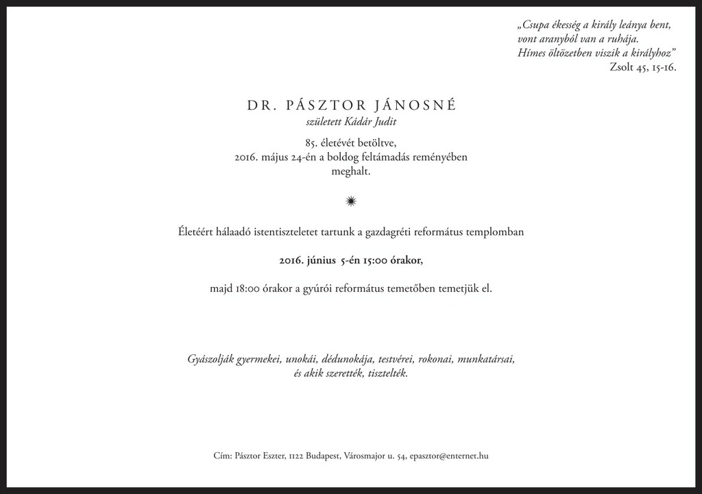 A Magyarországi Református Nőszövetség korábbi elnöke 85 éves volt.