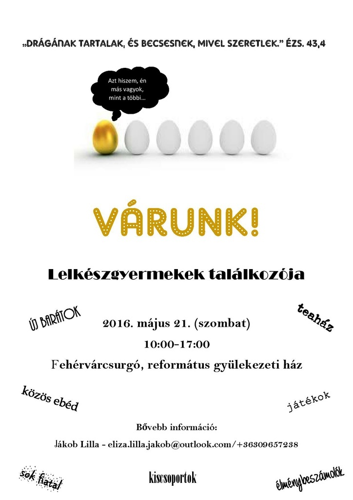 Kedves Lelkészlakbeli Társaim! Sok szeretettel hívlak és várlak Benneteket 2016. május 21-én szombaton 10 órától. Gyertek, ismerjük meg egymást!