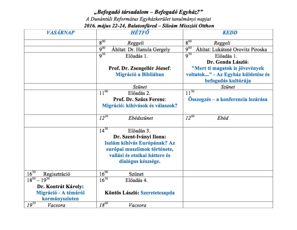 A Dunántúli Református Egyházkerület egyházkerületi és egyházmegyei tanulmányi előadói által szervezett "Befogadó társadalom – Befogadó Egyház?" című akkreditált konferenciájára április 29. 12 óráig lehet jelentkezni.