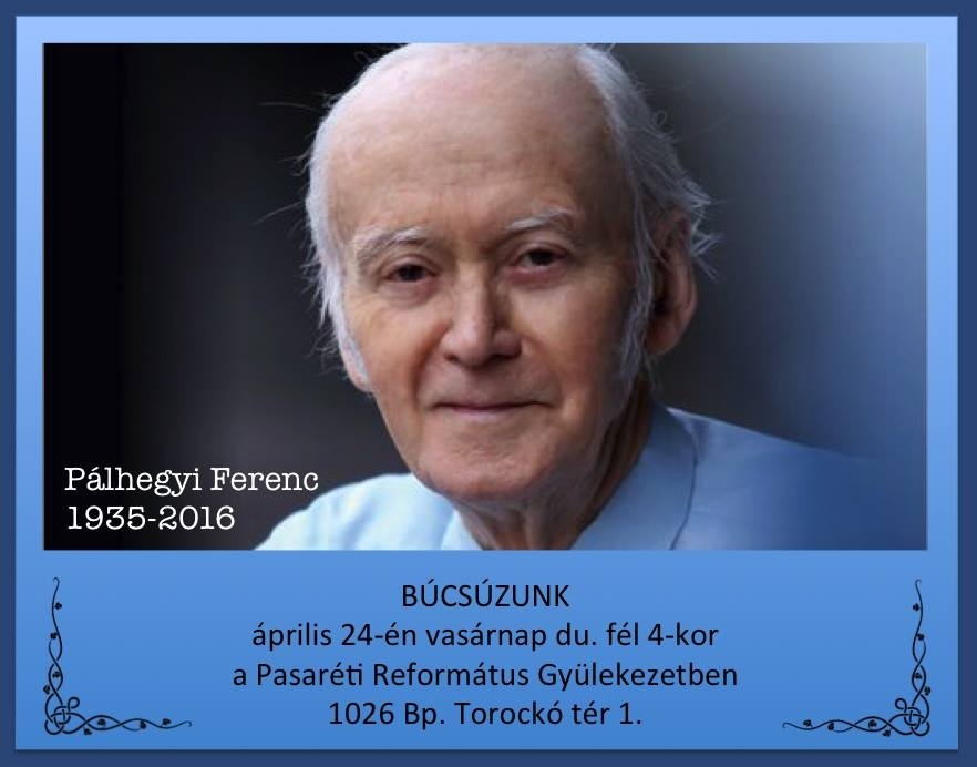 Pálhegyi Ferenctől búcsúznak április 24-én vasárnap délután fél négykor a Pasaréti Református Templomban. Pálhegyi Ferenc gyógypedagógus, pszichológus, a Bibliai Házassággondozó Szolgálat vezetője 81 éves korában, húsvét hétfőjén tért vissza Teremtőjéhez. „Nagyon fontos az élő hit. Az is élő hit, ha kimondja az ember, hogy Isten jó, amikor a betegség nagyon rossz" – mondta nem sokkal a halála előtt egy beszélgetésben.