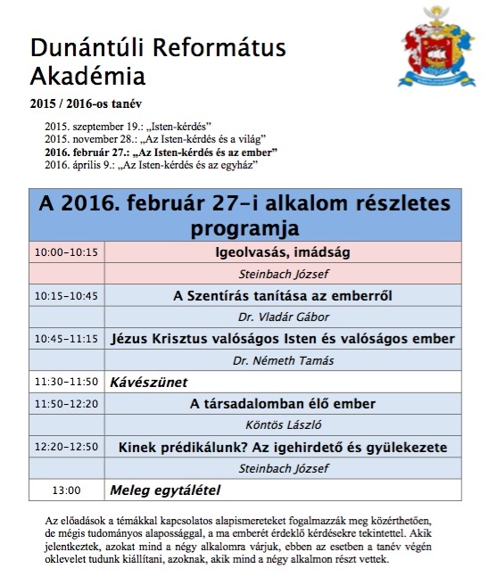 A Dunántúli Református Egyházkerület és a Pápai Református Teológiai Akadémia a 2015/2016-os tanévben elindította a Dunántúli Református Akadémiát. A harmadik előadási napra február 27-én kerül sor.