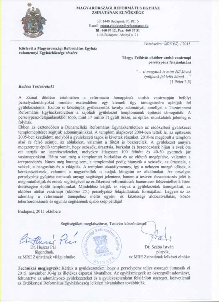 A Zsinat Elnöksége levélben fordult a Magyarországi Református Egyház gyülekezeteihez az október végi perselyadományokkal kapcsolatban.