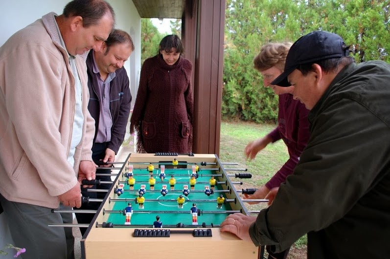 Vendéglátóink sportosra tervezték a napot, amire az udvar adta lehetőségek bő tára kínálkozott. Főjegyző urunk Nemes Gyula és felesége által készített fenséges finom ebéd után a bátrabbak látva az eső csendesedését focizni kezdtek.