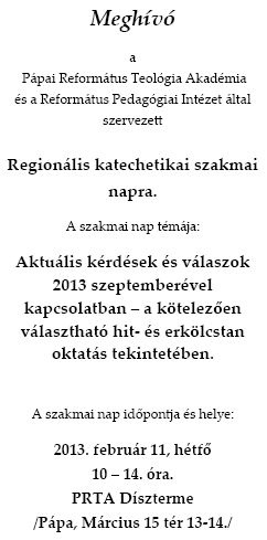 Szintén előre látható kihívás az év során egy fontos és nagy feladat: a 243/2012.11.16. Zsinati szabályrendelet rendelkezik arról, hogy minden egyházközségnek helyi hittantantervet kell készítenie. Azért, hogy ez a munka zökkenőmentesen történjen, a RPI szeretne segítséget nyújtani. 2013. január 30-án szakmai napot tartunk, melynek fő témája az egyházközségek helyi hittan tanterve, illetve néhány minta bemutatása is történik.