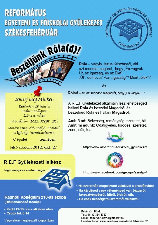 Szeretettel meghívunk Benneteket az Országos Református Nőszövetség a Magyarországi Református Egyház Zsinati Irodájának Tanácstermében (1146 Budapest, Abonyi út 21.) 2012. szeptember 29-én 10 órai kezdettel rendezendő konferenciájára, melynek fő témája „A Református Egyház és a Református Nőszövetség feladatai változó társadalmunkban. Református válaszok korunk szociális kérdéseire"