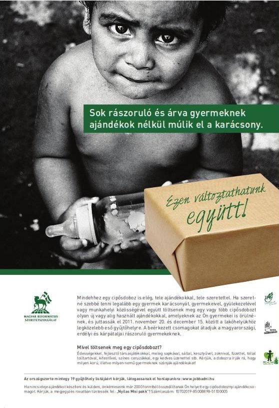 Készíthet ön is csomagokat és szervezhet csomagkészítő összejöveteleket, ami az ajándékozás és az alkotás örömét is adhatja a résztvevőknek. Az így elkészült csomagokat juttassa el 2011. november 20. és december 15. között a lakóhelyéhez legközelebb eső gyűjtőhelyre vagy küldje el postán a Magyar Református Szeretetszolgálat valamelyik irodájába. Az így beérkezett csomagokat átadjuk magyarországi, erdélyi és kárpátaljai rászoruló gyermekeknek.