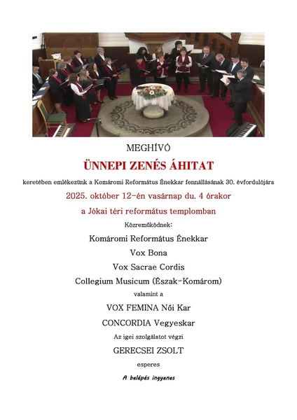 A 2025. október 26-án 15.00-kor kezdődő egyházmegyei reformációi istentiszteleten a az igehirdetés után előadás hangzik el, az ünneplő gyülekezet pedig első alkalommal úrvacsorai közösségben is részt vesz. Az istentisztelet plakátja ide kattintva érhető el.