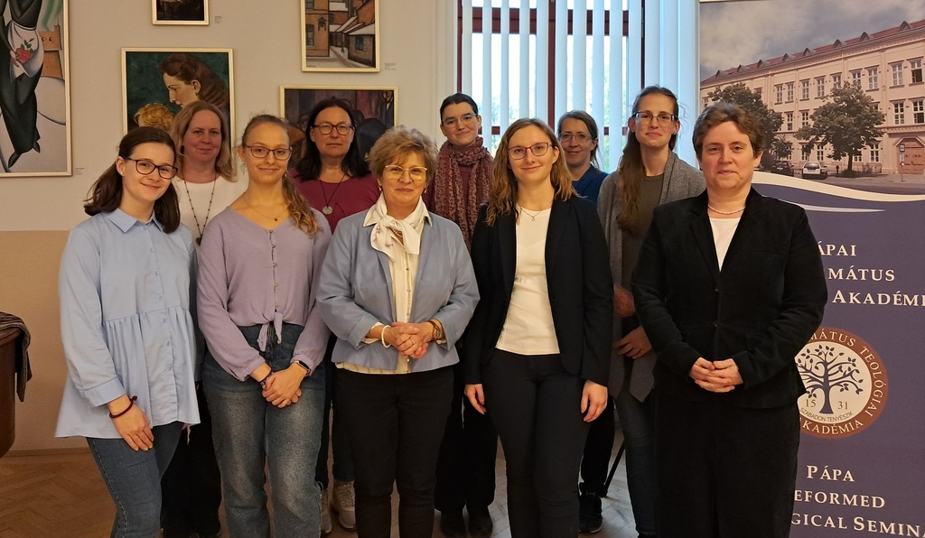 Körünkben köszönthettük a debreceni egyetemi nőszövetség 3 tagját Dobi Dóra teológa vezetésével, akik már október 23-án megérkeztek Pápára, hogy a teológia egykori és mostani diákjaival, valamint Pápa gazdag református örökségével és jelenével ismerkedjenek. A találkozás Némethné Schédl Tímea, a Pápai Nőszövetség elnökének áhítatával kezdődött. A 100. zsoltárból szóló ige alapján emlékeztetett a hálaadó élet és a cselekvő szeretet fontosságára, mely tulajdonképpen minden nőszövetségi szolgálatunk alapja. Beszélt az Isten munkájáról, aki megszólít, azaz hív, aztán elhív, azaz küldetést ad, szolgálatba állít, melyhez erőt és áldást ad. Emberi oldal pedig 1. ujjonghat az Úr előtt 2. szívből szolgálhatja 3. A szolgálat közben megismerheti mind jobban Őt 4. elé járulhat örömében és bánatában 5. hálaadással Istent magasztalhatja és 6. hirdetheti hűségét és szeretetét. Ezután Tatai Márta vezetésével beszélgettek egymással a pápai és a debreceni egyetemisták és alumnisok. Másnap a Pápai Nőszövetség látta vendégül reggelire a csapatot az Immánuel gyülekezeti házban. Tatai Márta pápai teológa áhítatának alapigéje Máté evangéliuma 6. részének 19-20. verse volt. Beszélt arról, nem mindegy, milyen kincseket gyűjtünk magunknak. A múlandó kincseink olyanok az Úr előtt, mint a felnőtt számára egy gyermek által kincsként szedegetett gesztenyék. Értéktelenek és feleslegesek. Legnagyobb örökkévaló kincsünk, hogy Jézus által mennyei állampolgárságunk lehet. Ebben a bizonyosságban hit által kereshetjük Urunk akaratát. Általa kinccsé lesz a törődés, az egymásra szánt idő, az együtt megélt kaland, az egymásra figyelés, a találkozások alkalmai. Az áhítat után sor került a gimnázium, a könyvtár, az újtemplom, a püspöki hivatal majd ebéd után a Pannonia Reformata múzeum állandó kiállításainak meglátogatására. Mindegyik helyszínen az adott intézmény ill. a pápai gyülekezet egy-egy autentikus képviselőjével is megismerkedhettek a résztvevők, betekintést nyerhettek a pápai ill. a dunántúli református élet különböző szegmenseibe.