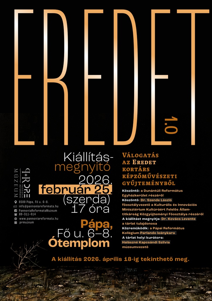 DTRE Kommunikációs Szolgálat, 2026-02-14 07:07:25Eredet 1.0 címmel nyílik kiállítás február 25-én, szerdán a pápai Ótemplomban. A Pannonia Reformata Múzeum tárlata válogatás az Eredet kortárs képzőművészeti gyűjteményből.