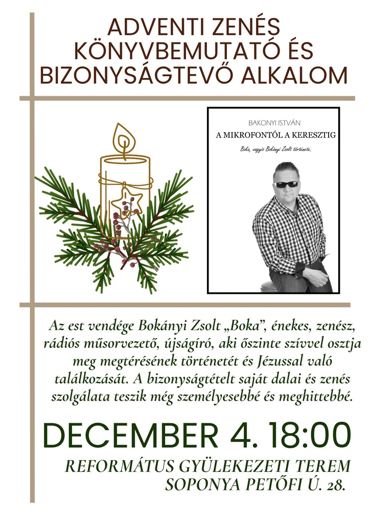 MEGHÍVÓ: Adventi zenés könyvbemutató és bizonyságtevő alkalom Soponyán 2025. december 4-én 18 órakor