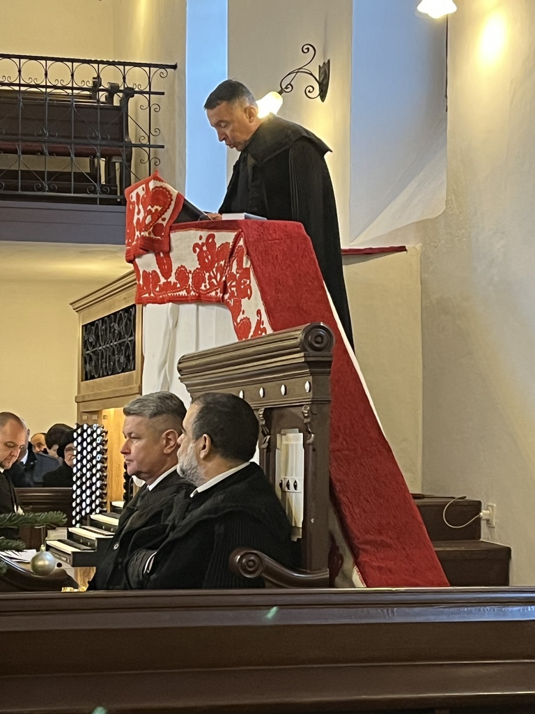 A református óvoda épületében gyülekeztünk. Itt köszöntöttük egymás, az esperes pedig minden jelenlevőt, akik között voltak egyházmegyénk lelkészei (volt, akik házastársával, családtagjával érkezett), egyházmegyénk területén élő nyugdíjas lelkészek, az egyházmegye több szintjén szolgálatot végzők.